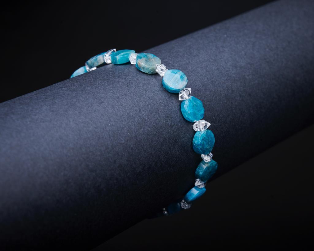 Genuine untreated blue Apatite raw NY Herkimer Diamond silver stainless steel clasp bracelet