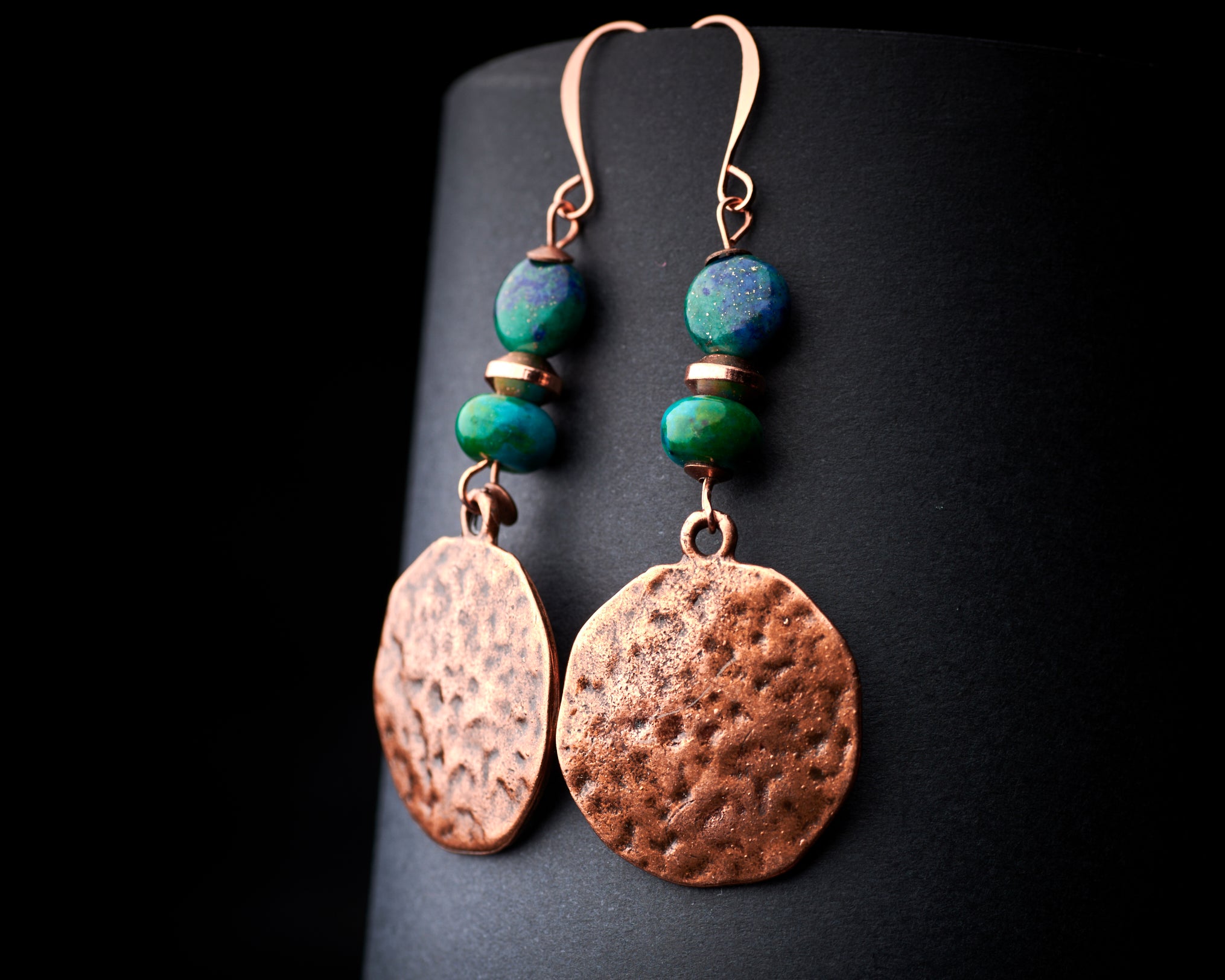 Natural blue green Azurite Malachite Chrysocolla gemstone solid copper french hooks 58mm long statement earrings