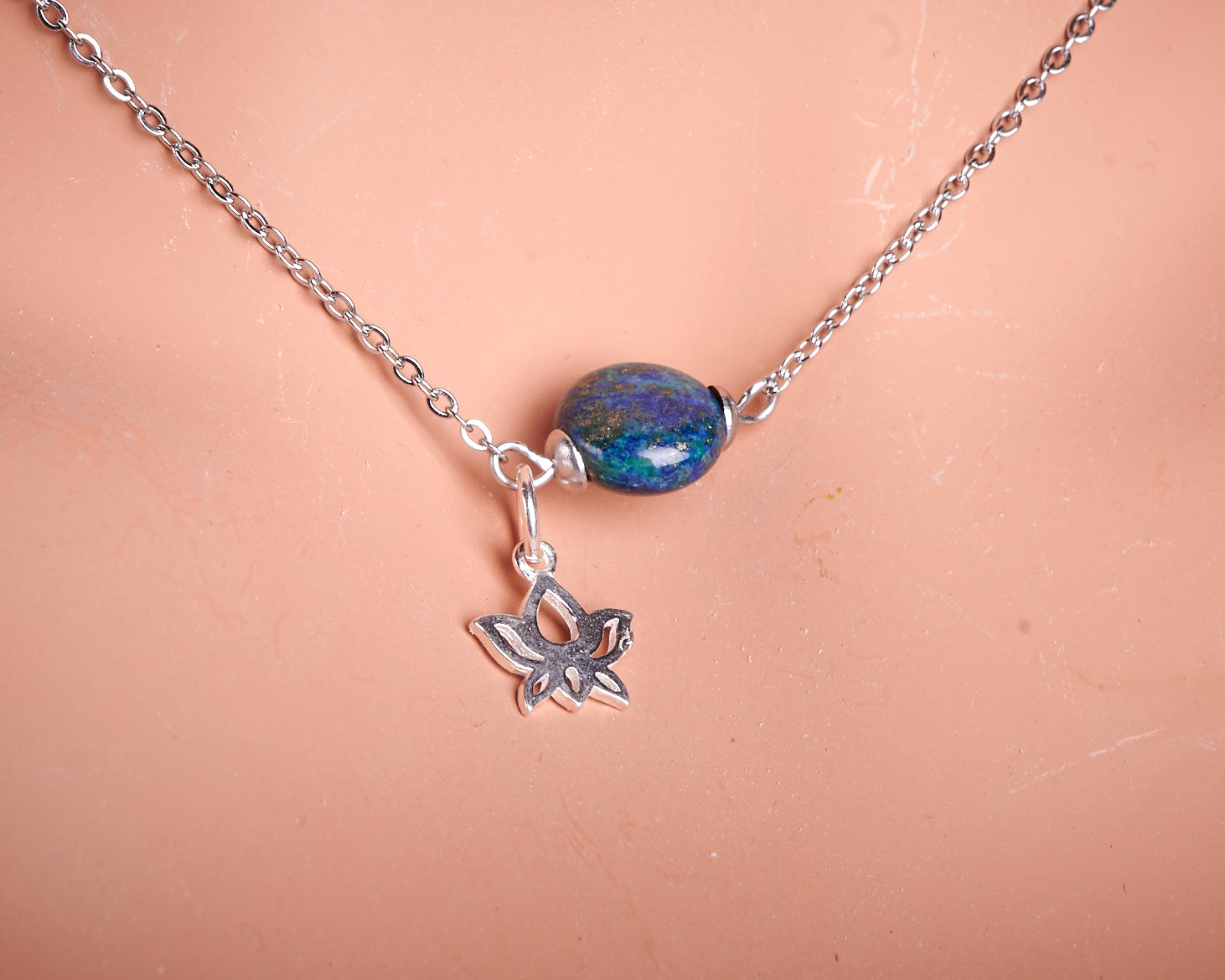Genuine Azurite Malachite 10mm coin solid sterling silver Lotus charm pendant necklace