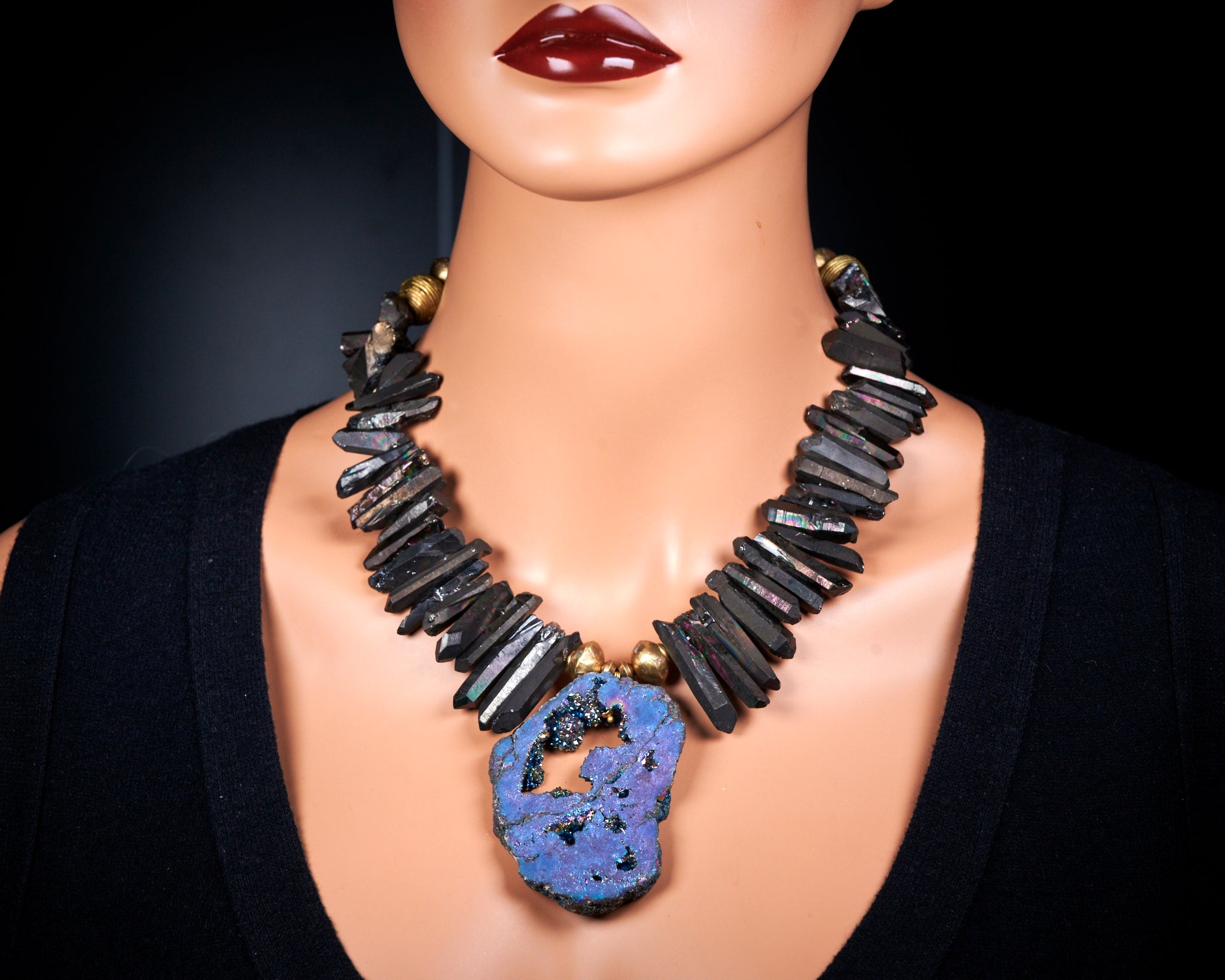 Genuine Black Rainbow Titanium Raw Quartz Points Statement Necklace, large multi color blue purple rainbow titanium druzy pendant, brass