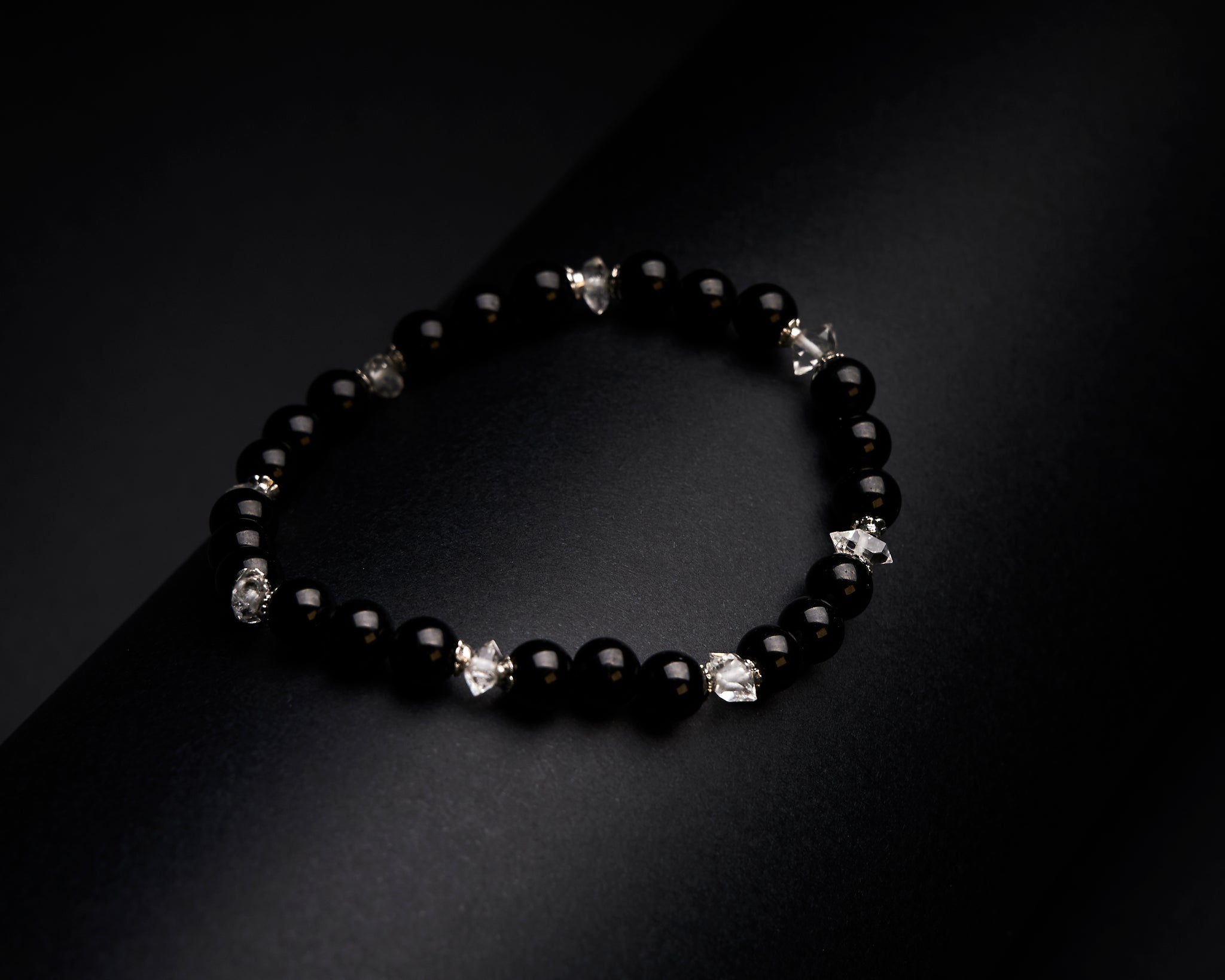 Genuine Black Tourmaline raw Herkimer Diamond stretch bracelet.