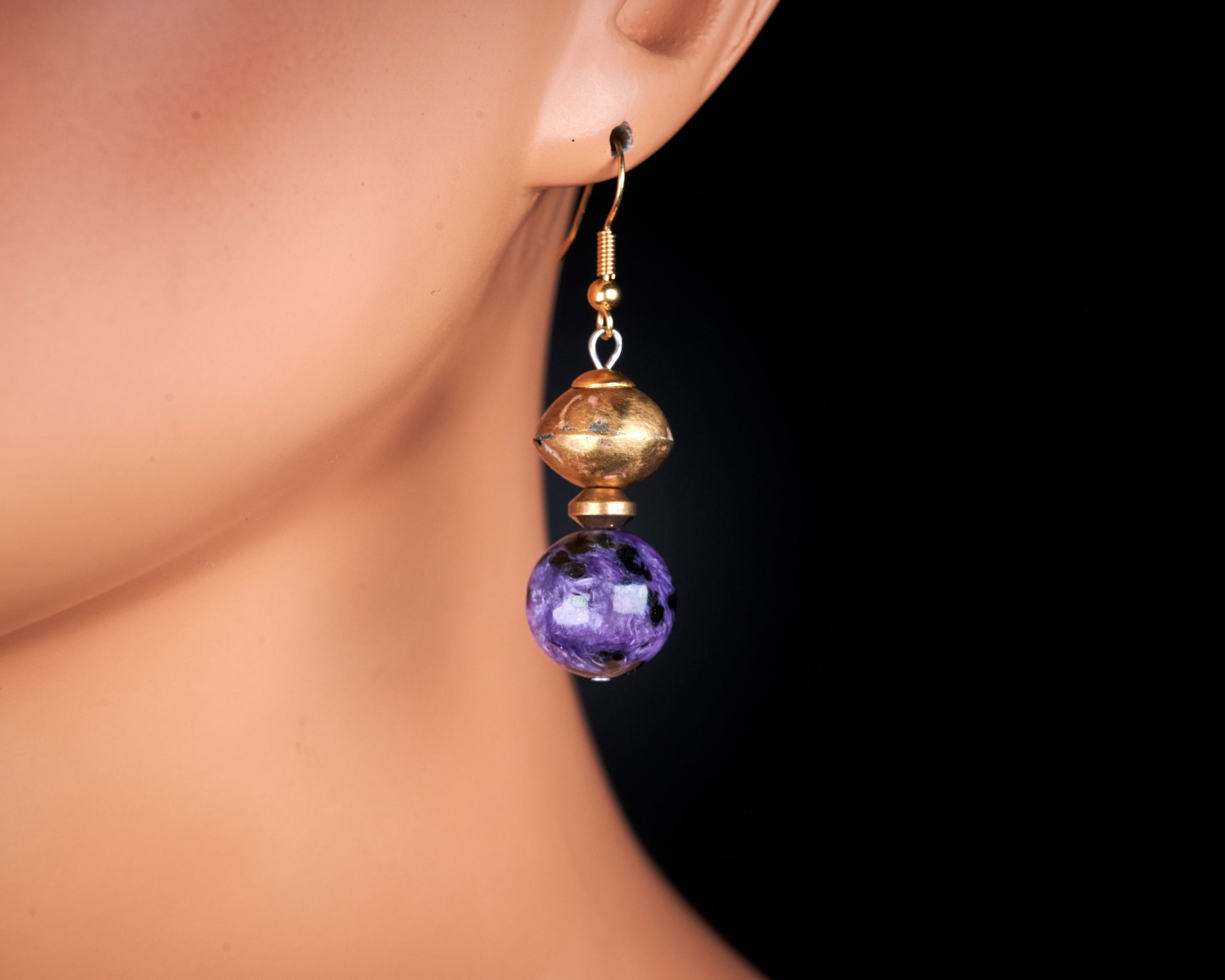 Genuine untreated purple black Charoite 14mm large beads gemstone African Made Antique Brass Beads gold stainless steel statement 50mm long earrings