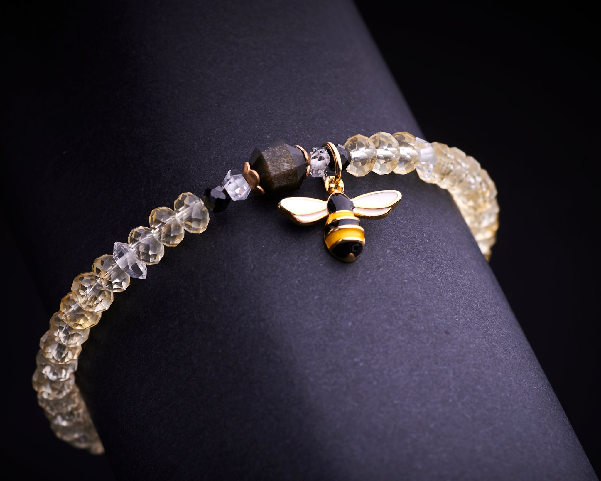 Genuine faceted Yellow Citrine raw NY Herkimer Diamond black Obsidian solid sterling silver adopt a little Bee delicate bracelet, solid sterling silver clasp
