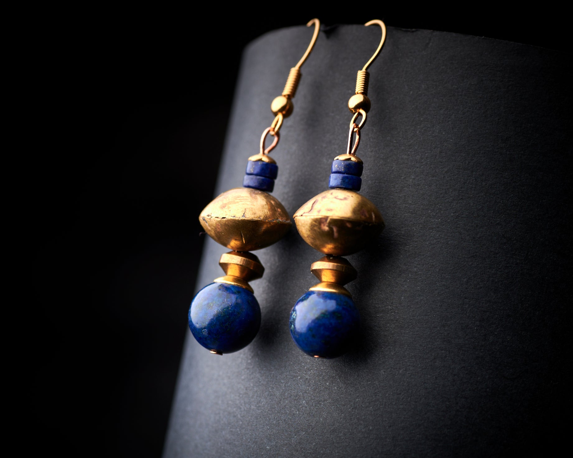 Genuine natural blue Lapis lazuli 10m, African Made Antique Brass Beads, gold plated stainless steel statement 40mm long earrings