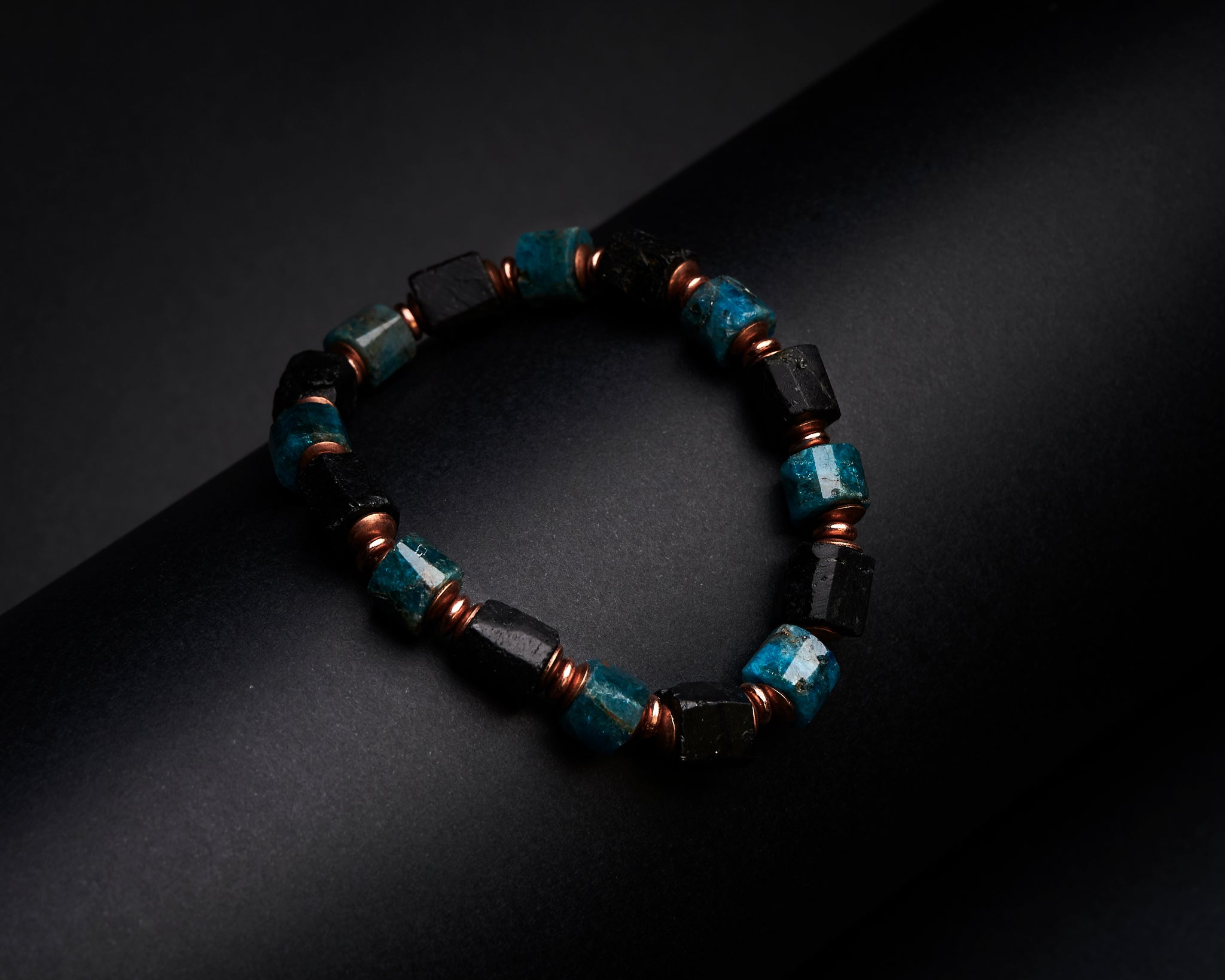 Men's genuine untreated raw black tourmaline , genuine lake blue Apatite 9mm,