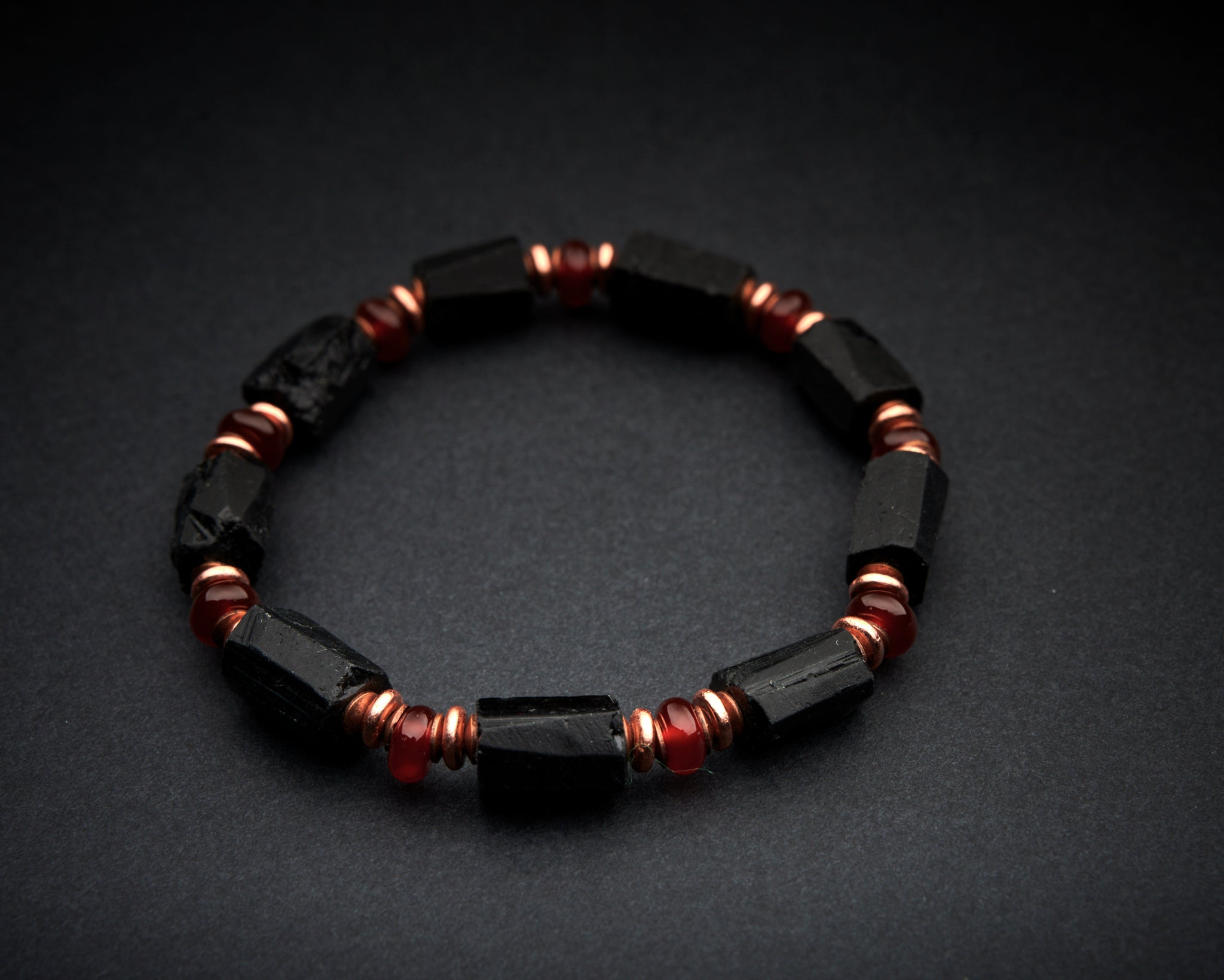 unisex men's Genuine untreated raw black tourmaline red orange Carnelian gemstone solid copper stretch bracelet