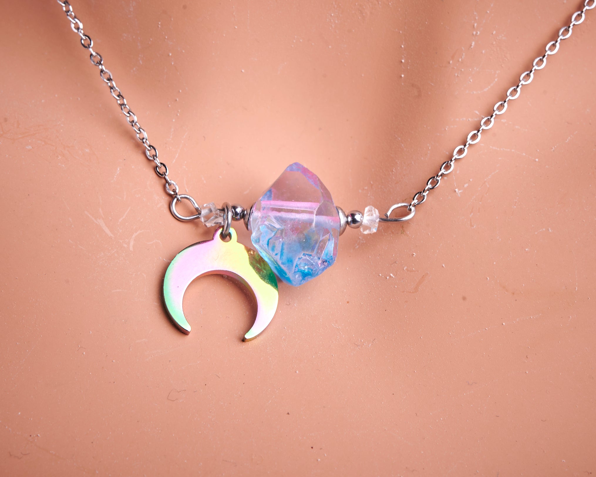 Multi color stainless steel crescent moon rough blue pink coated Angel Aura quartz pendant