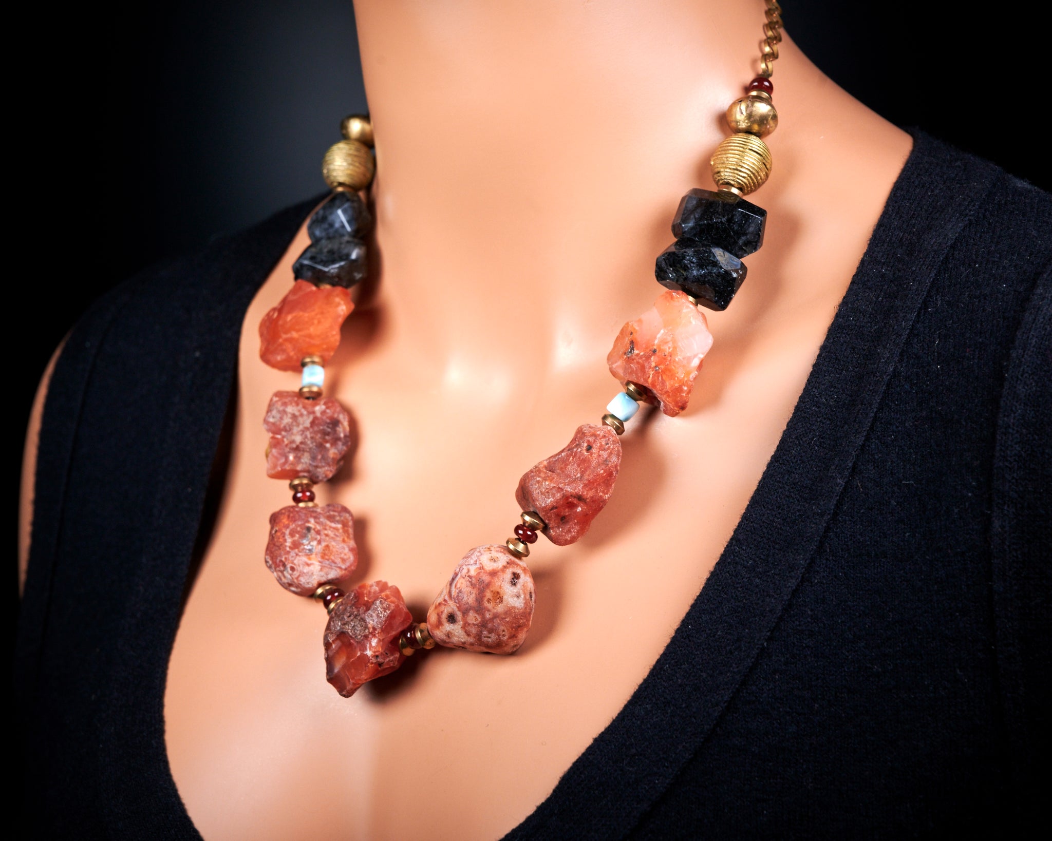 Huge big statement Genuine untreated raw rough orange red Carnelian agate gemstone blue Larimar black rutilated quartz handmade African brass beads beaded necklace