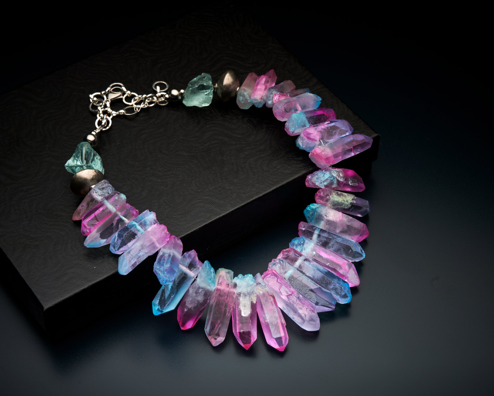 Rough blue pink purple quartz point necklace. Natural raw coated clear quartz point handmade African silver beads beaded necklace